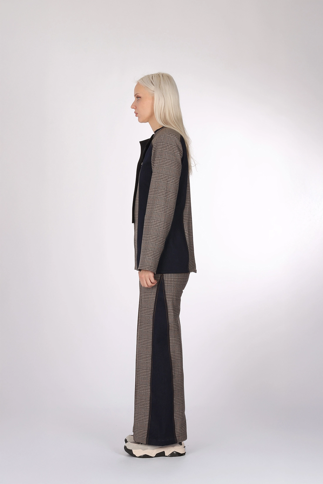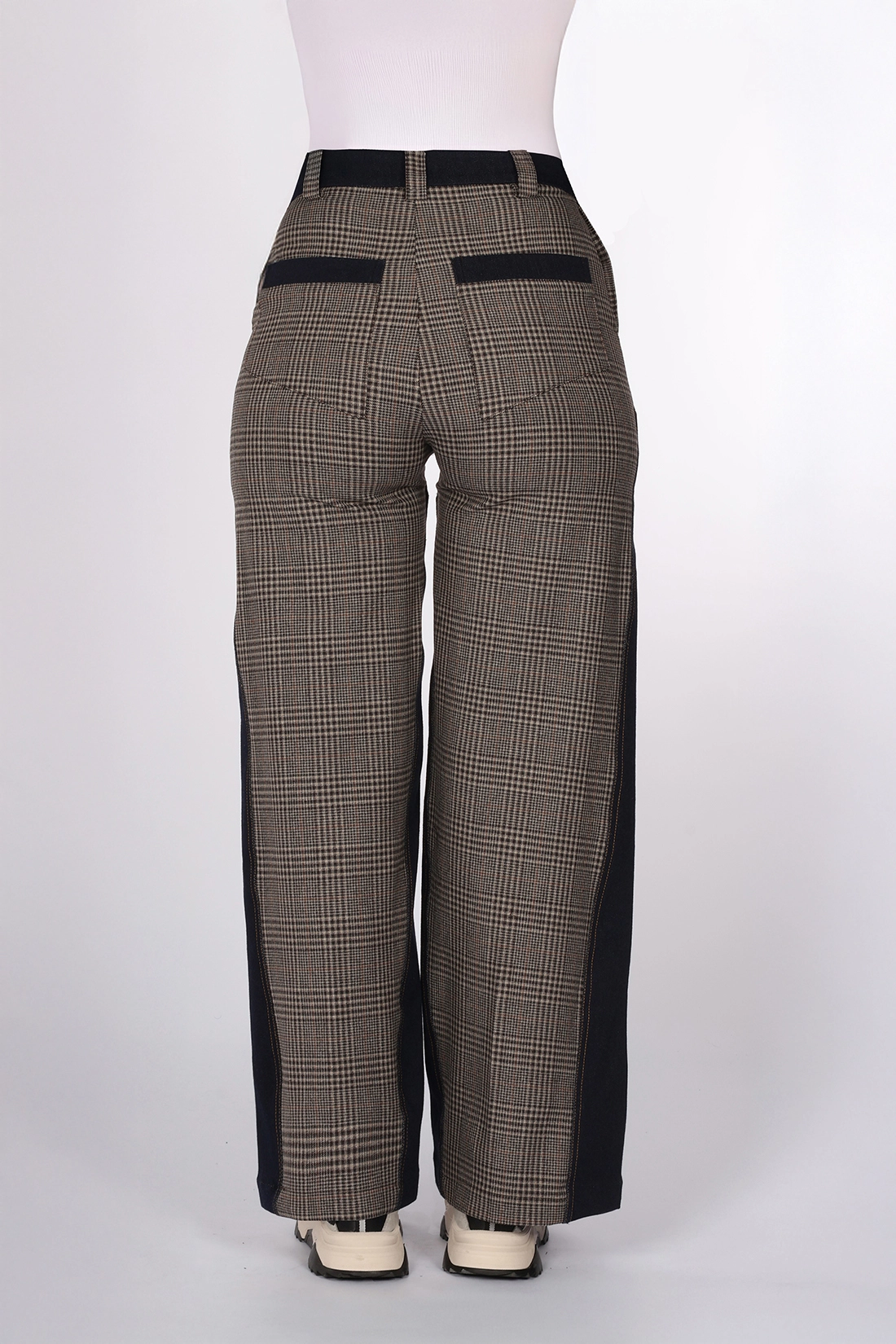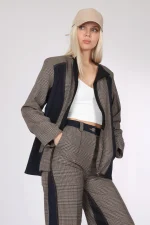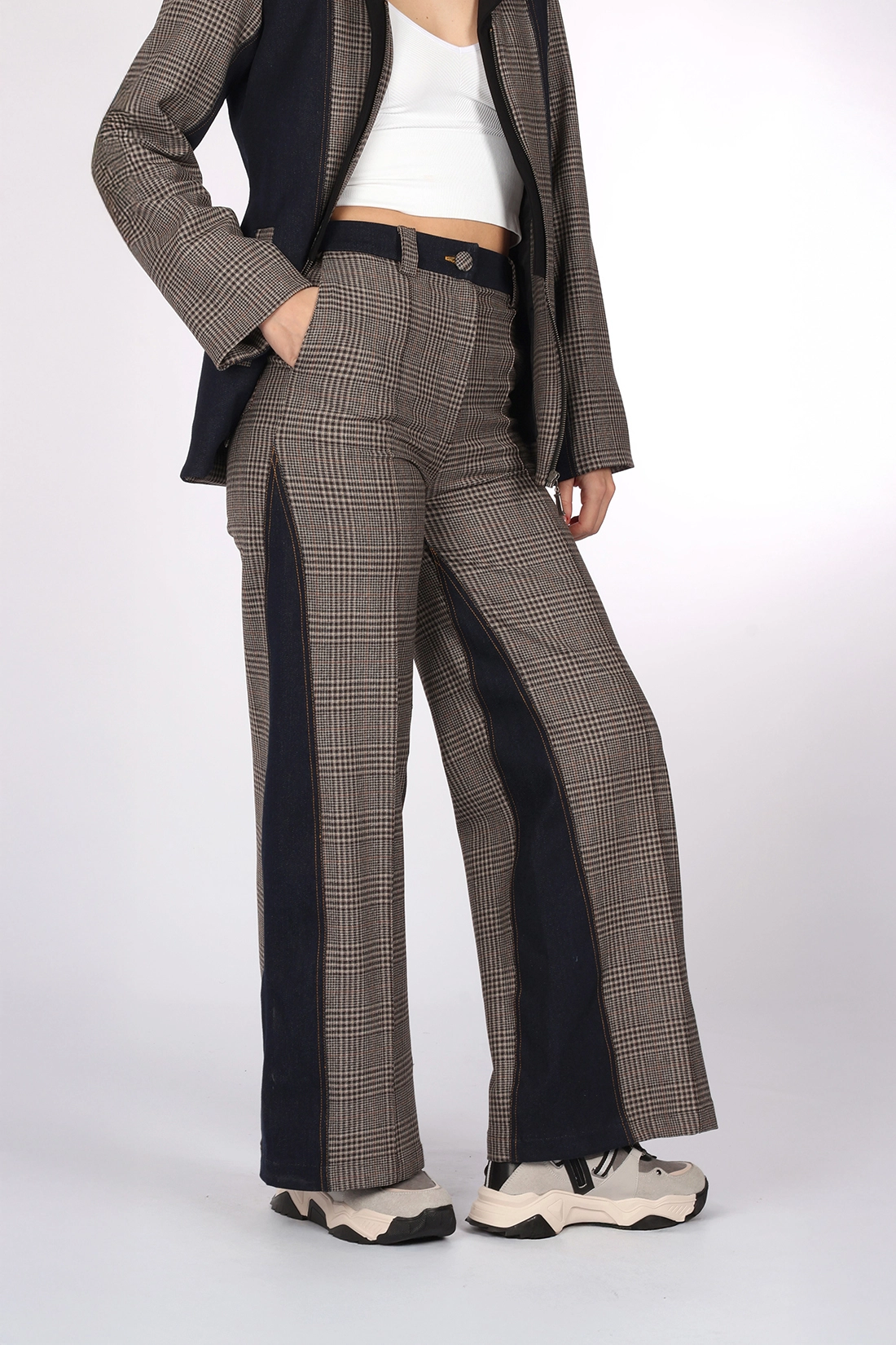- Denim ve Kahve tonlarında ekose desen kumaş kombin