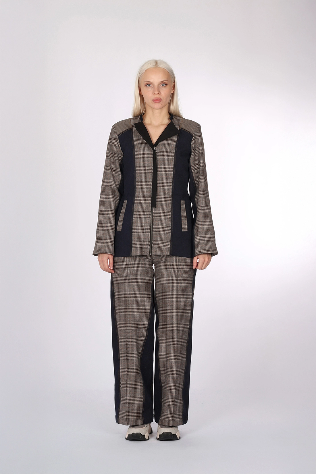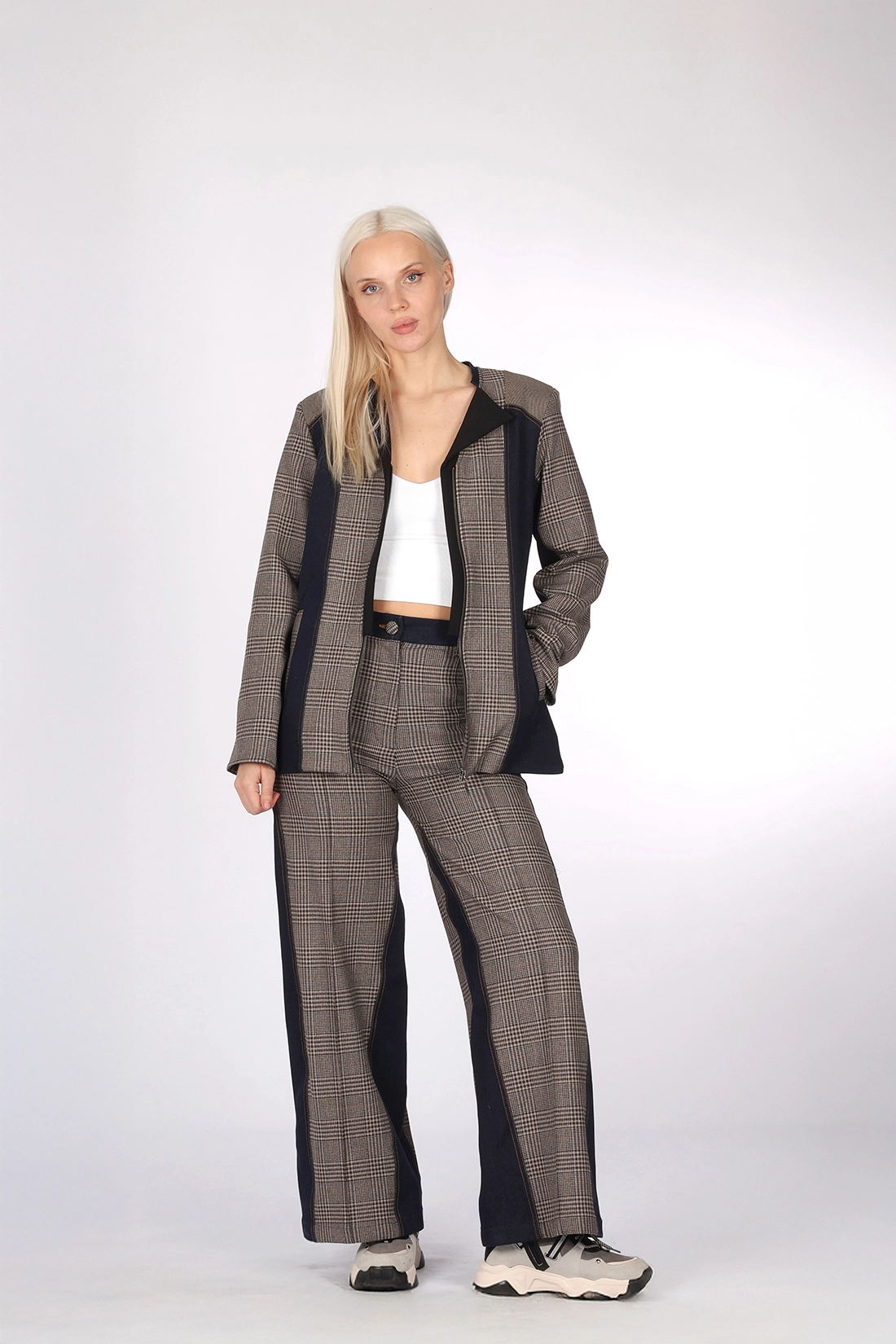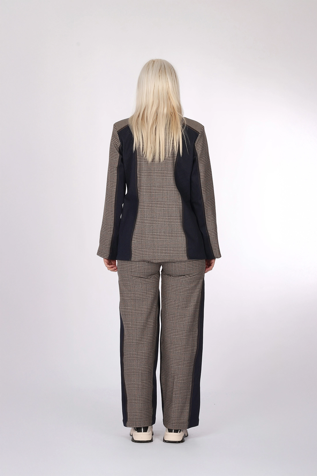 - Denim ve Kahve tonlarında ekose desen kumaş kombin
